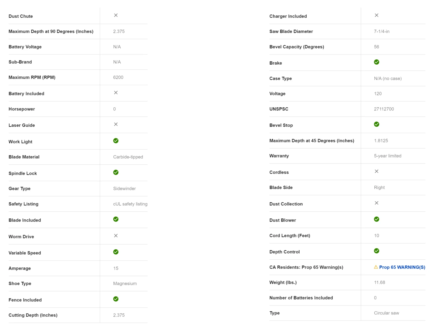 - 7-1/4-In carbide-tipped steel blade, blade wrench and edge guide are included